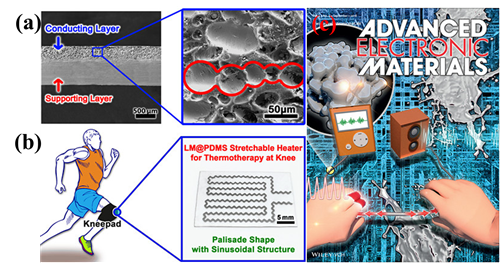 图1 (a)具有葫芦串导电网络结构的液态金属可拉伸导体;(b)基于液态金属可拉伸导体的弹性加热片;(c)论文封面