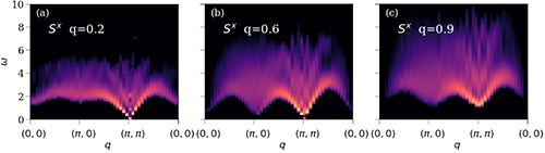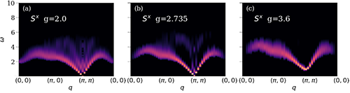 该团队运用量子蒙特卡洛和随机解析延拓的大规模计算方法 (quantum Monte Carlo and stochastic analytic continuation) ,计算了 图1 (a) 和 (b) 的两种相变过程中系统的自旋激发谱,结果总结在 图2 和 图3中。图2 (a), (b) 和 (c) 是去禁闭量子相变对应的过程。图1 (a) 系统仍在 AFXY 相里,能谱上得到自旋波的图像,在 (π, π) 点处自旋波为无能隙的 Goldstone 模,在其他动量点上自旋波色散开来,谱线在能量上的展宽来自于自旋波之间的散射。但在 图4 (b) (?可能就是2(b))中,系统接近 DQCP,整个能谱在 w(能量) – q (动量) 空间上生成出漂亮的连续谱。这连续谱有几个突出的特点: