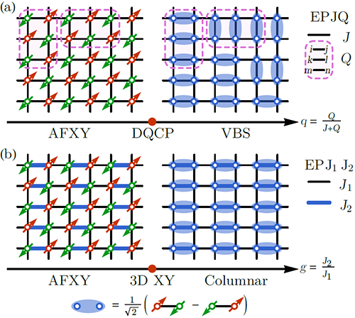 图1(a) 具有去禁闭量子临界点的 易磁化面 J-Q (EPJQ) 模型。q=Q/(J+Q) 为相变的调控参数。q < DQCP,系统具有破缺自旋旋转对称性的 易磁化面 反铁磁长程序 (antiferromagnetic XY order, AFXY);q > DQCP,系统具有破缺晶格旋转对称性的共振价键长程序 (valence bond solid, VBS)。两者之间是去禁闭量子临界点, DQCP。(b) 具有普通3DXY 量子临界点的 易磁化面 J1-J2 (EPJ1J2) 模型。g=J2/J1 为相变的调控参数。g < 3DXY, 系统具有破缺自旋旋转对称性的 AFXY 长程序;g > 3DXY,系统进入没有破缺任何对称性的 VBS。两者之间是 3DXY 相变点,服从 LGW 描述。
