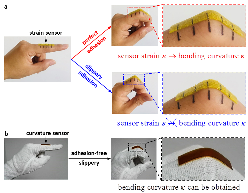 图1. (a)应变传感器与(b)曲率传感器用于关节弯曲变形监测的优劣势