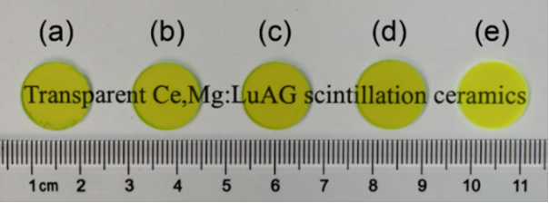 不同温度退火的LuAG:Ce,Mg闪烁陶瓷实物照片:(a)未退火、(b)1000摄氏度、(c)1100摄氏度、(d)1300摄氏度、(e)1450摄氏度