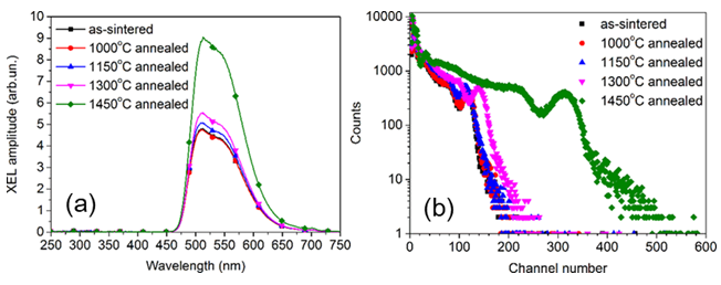 同温度退火LuAG:Ce,Mg陶瓷的X射线激发谱(a)与脉冲高度谱(b)