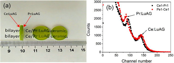 LuAG:Ce /LuAG:Pr复合陶瓷闪烁体的实物照片(a)与脉冲高度谱(b)