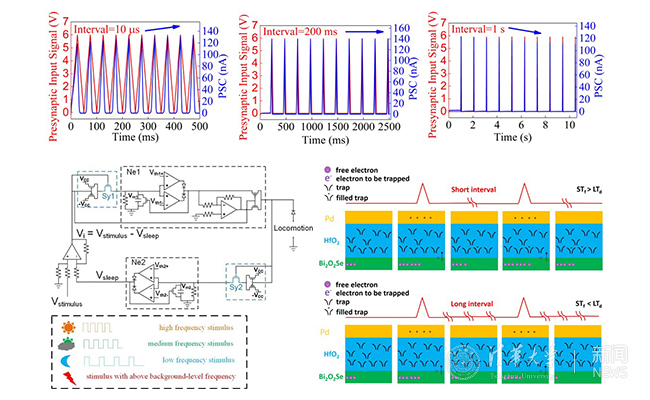 作为重要的神经突触仿生器件,忆阻器在过去十年中被广泛关注和研究。然而在以往的忆阻器中,长短期可塑性不能被同时和独立表达,这与生物突触中的行为截然不同。这一问题极大限制了基于忆阻器的类脑计算硬件网络功能。针对这一问题,该项工作提出利用三端忆阻器件实现长短期可塑性物理过程的空间分离和独立表达。电学测试表明,长短期可塑性的同时存在导致器件特有的电学响应特性。基于杂化密度泛函的量子力学第一性原理计算进一步解释了可塑性的原子尺度物理机理。这项工作也首次将硒氧化铋这种新型高迁移率层状半导体材料应用到忆阻器中,有望实现高速度、低功耗器件。借助长短期可塑性的共存特性,该项工作还建立了一个启发式的神经内稳态过程动力学模型,并通过循环脉冲神经网络进行了模拟。