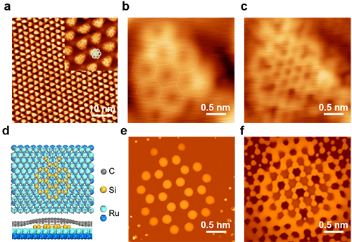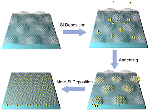 图1. 在石墨烯/Ru(0001)界面处的硅烯结构形成示意图。在退火过程中,沉积的Si原子插入到石墨烯和Ru基底之间。沉积量较小时,Si原子在石墨烯摩尔斑图atop区域(隆起的区域)下方形成蜂窝状硅烯纳米薄片。随着Si沉积量的增加,插层结构形成硅烯单层结构。 |