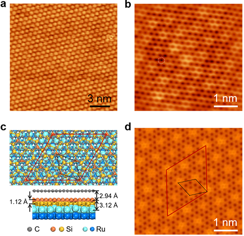 图3. 单层硅烯的STM图像及理论模拟。(a)石墨烯/硅烯异质结构生长在Ru(0001)表面的STM图像。(b)表层石墨烯晶格的原子分辨率图像。(c)(7×7)Ru(0001)/(√21×√21)硅烯/(8×8)石墨烯异质结构模型的顶视图和侧视图(超晶格元胞由红色菱形标记)。(d)(c)中构型的第一性原理模拟STM图像。 |