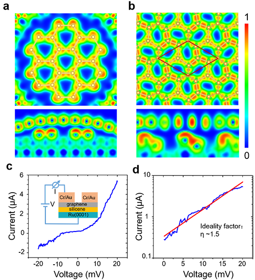 图4. 石墨烯/硅烯异质结构的电子局域函数(ELF)计算和输运特性。(a,b)硅烯纳米片和单层硅烯在硅原子平面的的电子局域函数(ELF)分布图。c)在105 K下测量的石墨烯/硅烯/钌垂直异质结构的电流-电压曲线,显示典型的肖特基型整流行为。插图是器件结构和测量的示意图。 d)伏安曲线的对数图。通过将其与Schockley模型拟合得到的理想因子为1.5。 |