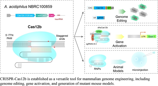 目前CRISPR系统中有两类效应蛋白家族(Cas9和Cas12a/Cpf1)被成功改造成哺乳动物及其它模式生物的基因组编辑工具,包括首先由Doudna JA、Charpentier E和Zhang F等实验室在2012年和2013年报道的Cas9系统。她/他们利用Cas9系统有效地实现了哺乳动物基因组的编辑,并带动了基因编辑领域的迅猛发展,将基因编辑技术成功拓展到基因转录表达调控、表观遗传修饰、全基因组功能筛选、碱基编辑、基因组成像和细胞谱系追踪等多种生物学应用。以及Zhang F等人在2015年发现并改造的Cas12a(又称为Cpf1)系统,也能实现哺乳动物等多个物种的基因组编辑。与此同时,科学家们也在一直致力于新的基因编辑系统的建立,尤其是更适合基因治疗使用的工具系统。