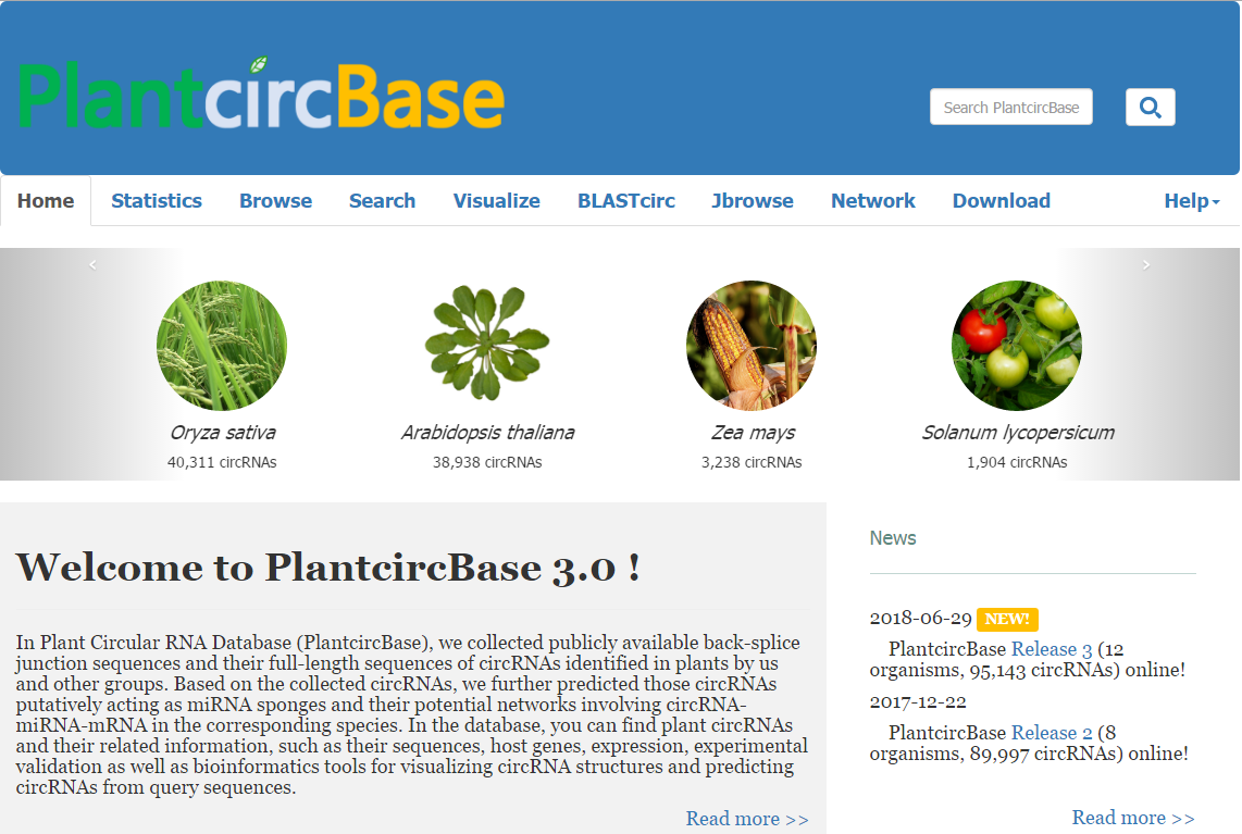 环形 RNA是由于特殊的反向剪接,使得下游序列与上游序列结合,引起序列的环化而形成。近年来circRNA分子在人类及动植物基因组中被大量鉴定,并被研究证明具有重要生物学功能,如作为 miRNA的靶标竞争分子、调控编码母基因表达、吸附蛋白等。事实上,该团队近年来一直从事circRNA工作,2015年在国际上率先证实水稻基因组中大量存在circRNA,该项工作发表在New Phytologist(Ye et al., 2015),在植物学界产生广泛影响,成为“Web of Science”高被引论文。同时,该团队前期构建的国际上第一个circRNA数据库PlantcircBase (Chu et al., 2017. Molecular Plant),目前已更新至第3版(图2),可通过http://ibi.zju.edu.cn/plantcircbase/index.php访问。该版收集了更多的circRNA,整合了更多最新结果,并增加多项分析功能(如可视化等)。