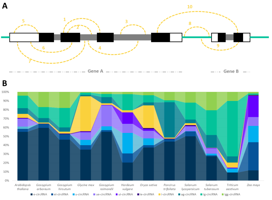 图1. 不同植物物种中各种类型circRNA分布比例。该研究共定义了10种不同类型circRNA(A)和水稻、拟南芥等12种植物物种中的分布(B)