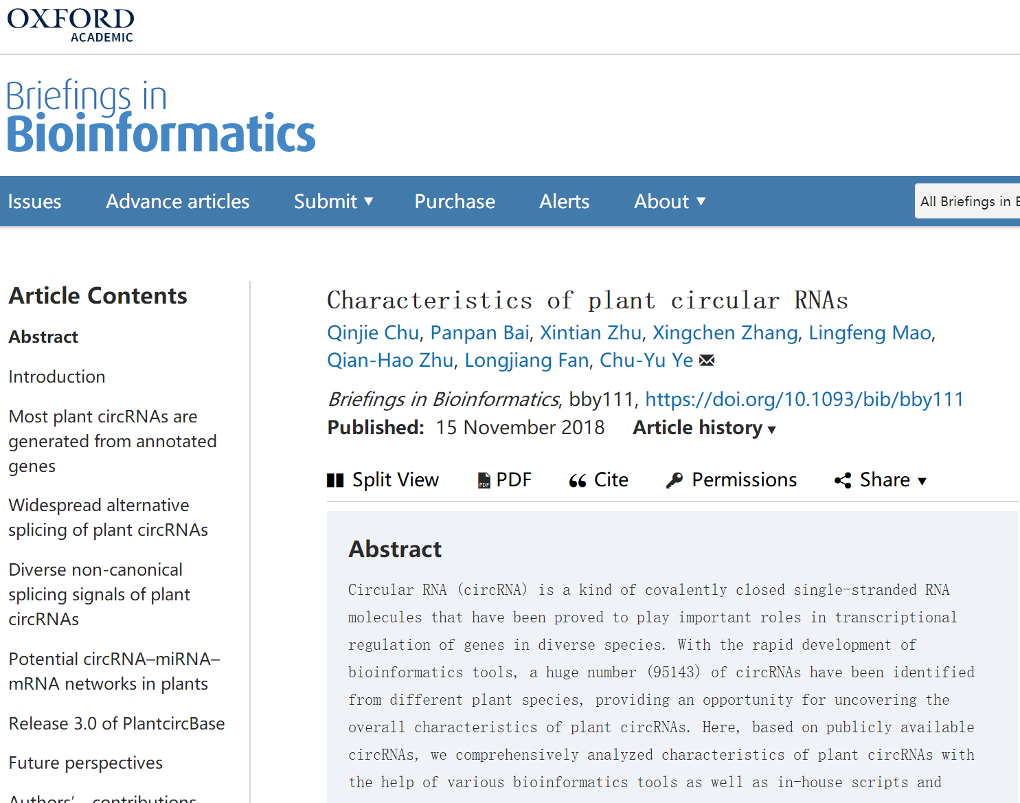 近日,生物信息学顶级期刊《Briefings in Bioinformatics》(IF5=7.065)在线发表农学院樊龙江教授团队论文“Characteristics of plant circular RNAs”(https://doi.org/10.1093/bib/bby111)。该论文通过分析目前已发表的植物环形RNA(以下简称circRNA)数据,揭示了circRNA特征,包括它的来源、可变剪接(可变环化)现象、剪接信号特征、潜在的miRNA-circRNA网络等,并提出circRNA统一命名规则(图1)。论文通讯作者为樊龙江团队叶楚玉副教授,第一作者为博士生褚琴洁。