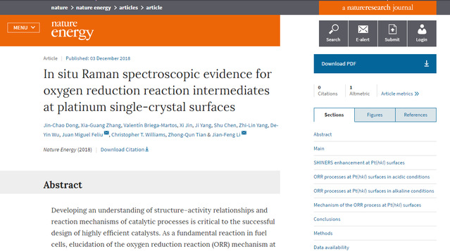 化学化工学院李剑锋教授课题组在铂单晶界面ORR反应机理原位拉曼光谱研究方面取得重大突破。相关研究成果“In situ Raman spectroscopic evidence for oxygen reduction reaction intermediates at platinum single crystal surfaces”于2018年12月03日在线发表于《自然-能源》(Nature Energy,doi:10.1038/s41560-018-0292-z, IF: 46.8)。 铂基催化剂表面的氧还原反应(ORR)是燃料电池重最重要的阴极反应。虽然经过几十年的研究,ORR的具体反应路径并没有真正解析清楚。人们一般认为铂表面的ORR过程可分为两类:一类是氧分子经过4电子的还原过程最终生成水或OH;另一类则是氧分子经过2电子的还原过程,生成过氧化物。但ORR过程在实际铂基催化剂表面的反应路径并未形成共识,因为该过程牵涉到众多痕量、短寿命的中间物种,难以被有效地捕获。同时复杂电化学环境也给ORR反应路径和机理的研究带来挑战。虽然原子级平滑的单晶表面具有确定的表面原子排布结构以及表面能级,是关联实验和理论的理想模型体系。然而原子级光滑的单晶表面难以获得增强的拉曼信号,无法获得直接的光谱证据,限制了人们对ORR反应过程的理解并用其指导高活性催化剂的制备。 在本研究中,李剑锋教授课题组首次利用其发展的电化学壳层隔绝纳米粒子增强拉曼光谱(SHINERS)技术原位研究了Pt(hkl)单晶表面的ORR反应过程,成功捕获到在1150 cm-1、1080 cm-1和732 cm-1区域O2-、OH*和HO2*等重要反应中间物种的直接拉曼光谱证据,并通过相应的同位素取代实验(氘和O-18同位素实验)及DFT理论模拟确认了中间物种的谱峰归属和吸附构型。并提出在酸性条件下,Pt(hkl)单晶表面的ORR反应机理为:O2分子先吸附到Pt(hkl)单晶电极上形成吸附态的O2*后,经过质子电子转移步骤后形成HO2*物种。而后O-O键断裂并在邻近铂原子上形成一对吸附态的O*和OH*,最后OH*通过质子电子转移形成H2O。由于相同中间物种在不同晶面上的Gibbs自由能和活化能不同,导致其存在状态和后续ORR反应的难易有别,因此不同Pt(hkl)单晶表面上的ORR活性有明显的差异。总的来说,该项研究首次在Pt(hkl)单晶表面原位获得ORR反应重要中间物种的直接拉曼光谱证据,提出合理的ORR反应路径,加深了人们对ORR反应机理的认识,也为其他界面催化反应机理的研究提供了一条可行的研究思路。 该研究工作由校内外多个课题组共同努力完成,化学化工学院李剑锋教授课题组负责相关电化学原位拉曼光谱实验,Alicante大学Juan Feliu教授课题组负责单晶电化学实验,化学化工学院吴德印教授课题组负责DFT理论模拟,物理系杨志林教授课题组负责3D-FDTD的理论模拟。该研究工作的第一作者董金超和第二作者张霞光分别为化学化工学院2014级博士生(已毕业)和2015级博士生。 该研究工作得到国家自然科学基金委(21522508、21427813、21521004、21533006、21621091和21775127)的大力资助和支持。化学化工学院周志有教授、程俊教授,材料学院张华副教授,英国利物浦大学Gary Attard教授,以及化学化工学院苏敏、王耀辉、卢邦安等博士生和杨晓冬博士对本课题的研究给予了大力的支持和帮助。 文章链接:https://www.nature.com/articles/s41560-018-0292-z 责任编辑:黄伟彬