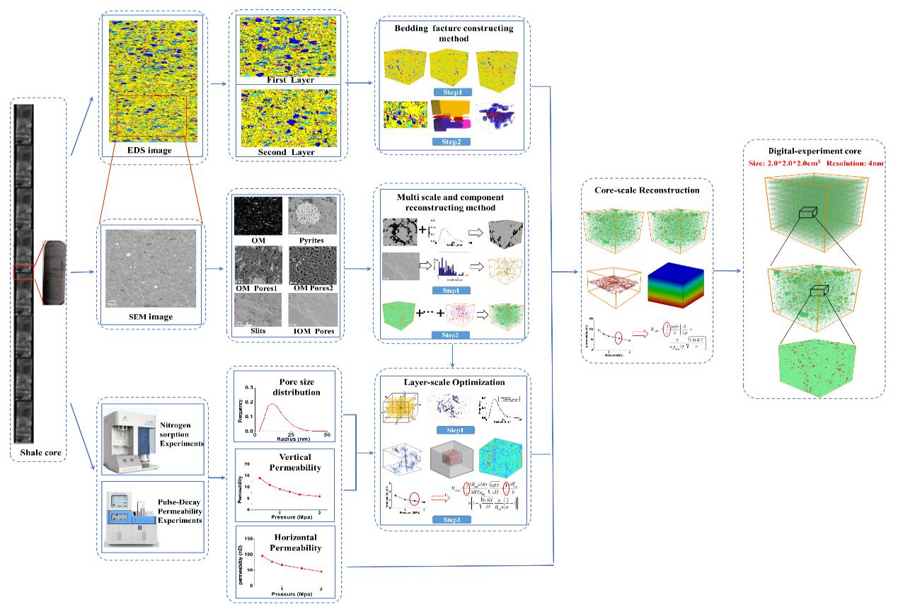 近期中科院力学所流固耦合实验室林缅研究团队针对以上两个问题取得了重要进展。研究人员针对页岩多尺度表征问题提出了一种全新的数字-实验岩心构建方法。基于二维高分辨率大面积扫描电镜(SEM)和X射线能谱仪(EDS)图像,以低温氮吸附孔径分布和各向异性渗透率实测数据为约束,发展了多尺度重构算法(CCSIM-TTS)和层理缝重构算法,首次实现了从纳米到厘米的页岩多尺度表征(如图1所示)。与传统的重构算法不同,林缅研究团队提出以实测数据为约束的概念,在保证有机孔、有机质块和层理缝等关键影响因素表征精度的同时,运用统计方法表征了无机孔、微裂缝、黄铁矿等的分布规律,使得数字-实验岩心既满足表征精度又大幅提高了计算效率。