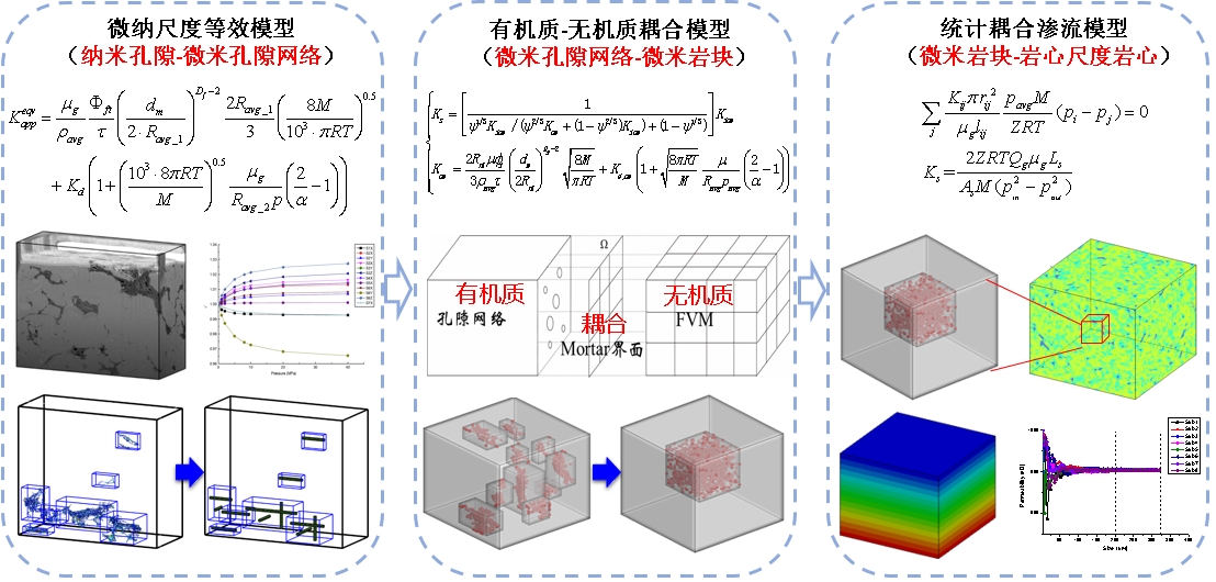 基于数字-实验岩心和课题组前期工作,研究团队提出将微纳尺度等效模型、有机质-无机质耦合模型及统计耦合渗流模型(图2),与数字-实验岩心相结合,形成了一套快速准确地计算页岩岩心渗透率的方法。该方法考虑了纳米喉道内的甲烷吸附、有机质内甲烷的努森扩散以及无机质内的达西流动,真正实现了页岩气从纳米到厘米的跨尺度渗流模拟。