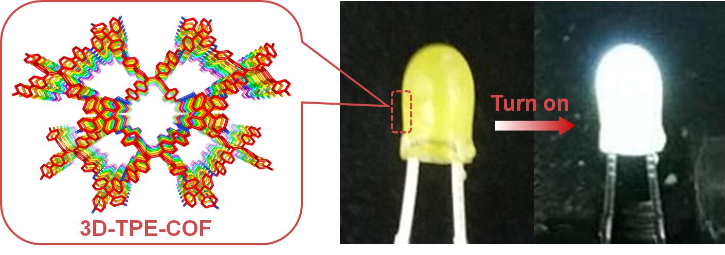 论文题为《含有聚集诱导发光基团的三维COF的构建及其在白色发光二极管中的应用》(An AIEgen-Based 3D Covalent Organic Framework for White Light-Emitting Diodes)。丁慧敏博士、黎建博士和谢国华副研究员为论文共同第一作者,汪成与北京大学孙俊良研究员为共同通讯作者。