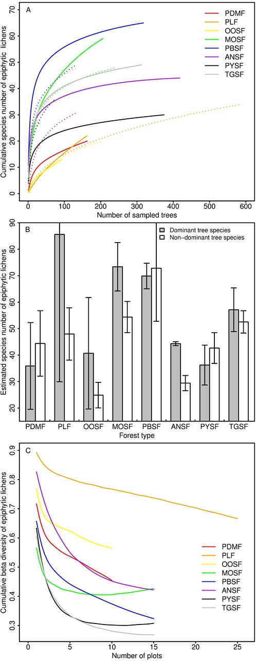 对附生地衣类群而言,宿主树木种类是代表包括树皮特征在内众多影响其物种分布的关键因子的综合指标。地衣生态学领域的现有研究往往更聚焦于森林群落优势树种在地衣物种多样性维系中的重要作用,而非优势树种尤其是稀有树种尽管被认为可能同样发挥着不可取代的作用,但往往由于个体数量较少,无法满足群落水平上的实验取样和统计分析要求,极少能够得到关注。故而,除少量描述性文献外,非优势树种在森林群落水平上维系地衣物种生长和分布的重要性,尚无严格的统计数据给予支持和证实。