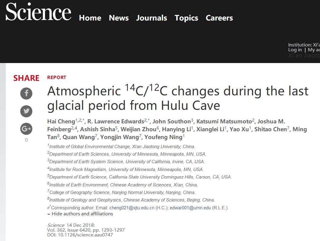 12月14日,《科学》杂志刊登了西安交通大学全球环境变化研究院程海教授等的最新研究成果——葫芦洞石笋记录的末次冰期大气14C/12C变化(Atmospheric14C/12C changes during the last glacial period from Hulu Cave)。