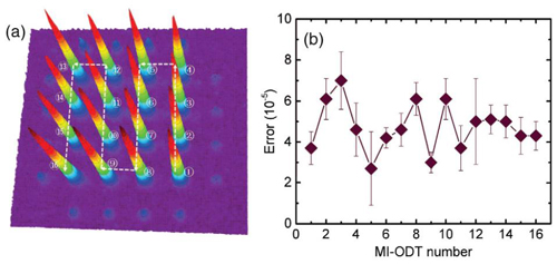 4X4魔幻光强偶极阱阵列示意图(a),每个格点囚禁一个原子,每个原子作为一个量子比特,格点之间相距5.2微米。图中数字是标记测量次序,箭头为标定的行进方向。图(b)是相应格点的门操作误差的测量结果。