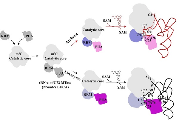 在王恩多和刘如娟研究员共同指导下,博士研究生李静等人揭示了PH1991确实是P. horikoshii tRNA:m5C72修饰酶(PhNSun6),并鉴定了它的tRNA底物。结合生物化学和结构生物学研究阐明了PhNSun6具有比hNSun6更广泛的tRNA底物,这是由于PhNSun6识别tRNA底物的以下特点:1. PhNSun6上的73位核苷酸结合口袋可以专一地容纳U73或G73的PhtRNA,而不像hNSun6该口袋只能容纳U73;2. PhNSun6缺少真核生物NSun6特殊的富赖氨酸线圈结构,使它不识别tRNA的D茎区域。PhtRNA的m5C72不影响PhNSun6氨基酰化活力,却可以略微升高PhtRNA的热稳定性。结合之前hNSun6的工作,研究人员提出了高等真核生物和超嗜热古细菌NSun6的进化模型。