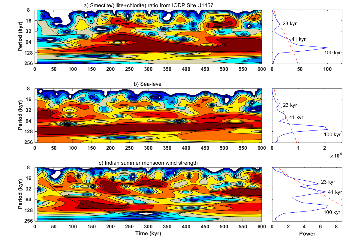 按照以上科学思想,于兆杰副研究员利用IODP 355航次在印度海底沉积扇采集的U1457钻孔样品的陆源沉积物的黏土矿物、粒度和Sr-Nd同位素分析结果,并结合美国、德国同行共享的主微量元素和磁化率数据,识别出了该地区冰期-间冰期旋回中不同沉积物的来源以及浊流发生的频率和厚度。不同于前人提出的季风降水主控沉积物输运和沉积的观点,U1457钻孔的研究结果表明,海平面变化对于沉积物从陆到海输运过程的控制作用更强,具体表现在:低海平面的冰期,印度海底沉积扇发育大量浊流沉积,而高海平面的间冰期,其则以悬浮沉积为主。U1457孔黏土矿物组成的小波分析结果表明,印度海底扇的沉积过程是海平面变化导致的偏心率周期主导,而非夏季风变化导致的岁差主导。该结论对于理解海洋沉积动力学过程及与气候、风化之间的联系具有重要意义。