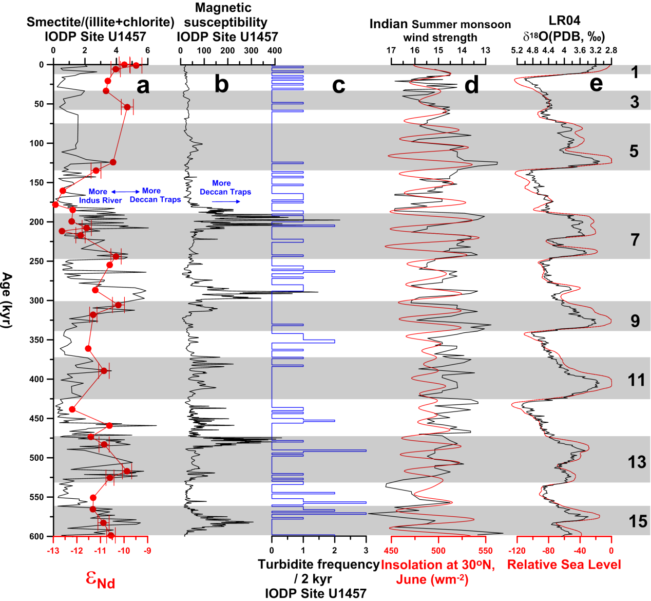 大陆风化过程不仅控制了入海的沉积物和溶解态元素通量,而且通过影响大气中温室气体的浓度而调控地球气候的变化。受到亚洲季风降水影响强烈的西太平洋-东印度洋-青藏高原大三角地区的陆源沉积物输入量占全球90%以上,是研究沉积物源汇过程及其动力学机制的关键海区。前人研究表明,地球轨道时间尺度上海平面变化和东亚夏季风演化都对东亚地区沉积物由陆到海输运过程具有重要的控制作用。然而,在东亚季风区,由于海平面变化和海洋夏季风代用指标都表现出强烈的偏心率(100 kyr)周期,因此东亚夏季风和海平面变化对沉积物输运过程的不同影响也一直未能有效区分。与之相对地,南亚地区海洋夏季风代用指标表现出强烈的岁差(23 kyr)周期波动,而受到南北极冰量控制的海平面变化具有全球一致性,表现出偏心率(100 kyr)周期主导的特征。如果能巧妙利用轨道时间尺度上南亚地区夏季风演化与海平面变化主控周期的差异性,将使得我们有机会将这两种不同过程对大陆风化沉积物输运入海的影响区分开来。