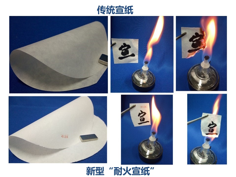 传统宣纸在火中几秒钟即快速燃烧化为灰烬;而新型“耐火宣纸”白度高,具有优异的耐高温、耐火性能,长时间在火中灼烧也不会燃烧