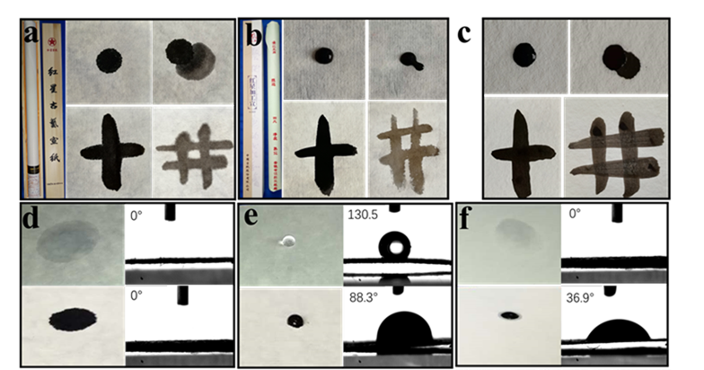 新型“耐火宣纸”具有独特的润墨性能: (a, d) 传统生宣纸的润墨性能以及水墨在纸表面的接触角; (b, e) 传统熟宣纸的润墨性能以及水墨在其表面的接触角; (c, f) 新型“耐火宣纸”的润墨性能以及水墨在其表面的接触角