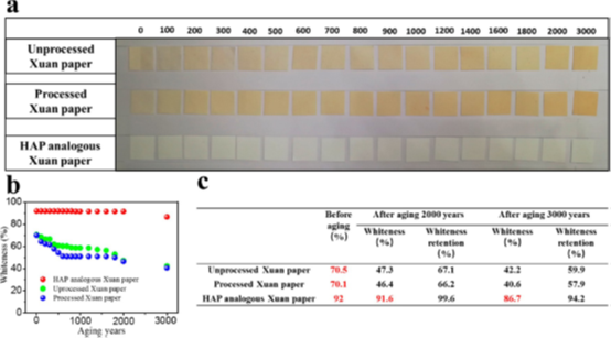 通过加速模拟老化方法评估所制备的新型“耐火宣纸”的白度稳定性,并与传统宣纸做比较: (a) 加速模拟老化至3000年的过程中,三种纸的白度变化; (b) 加速模拟老化至3000年的过程中,三种纸的白度变化曲线图; (c)加速模拟老化2000年和3000年后,三种纸张的白度和白度保持率