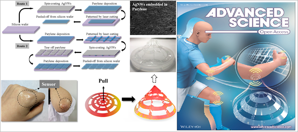 随着人们日益重视生理健康,越来越多的业界人士致力研发可贴附在人体各个部位的柔性可穿戴式传感器,用于监测温度、心率、肌电、血压等多种生理特征。然而,对于起伏很大、拉伸形变明显的身体部位,尚需构建一个更加立体的可变形结构,实现与皮肤在任何状态下的共形接触,提高信号质量,减少监测时的噪声。