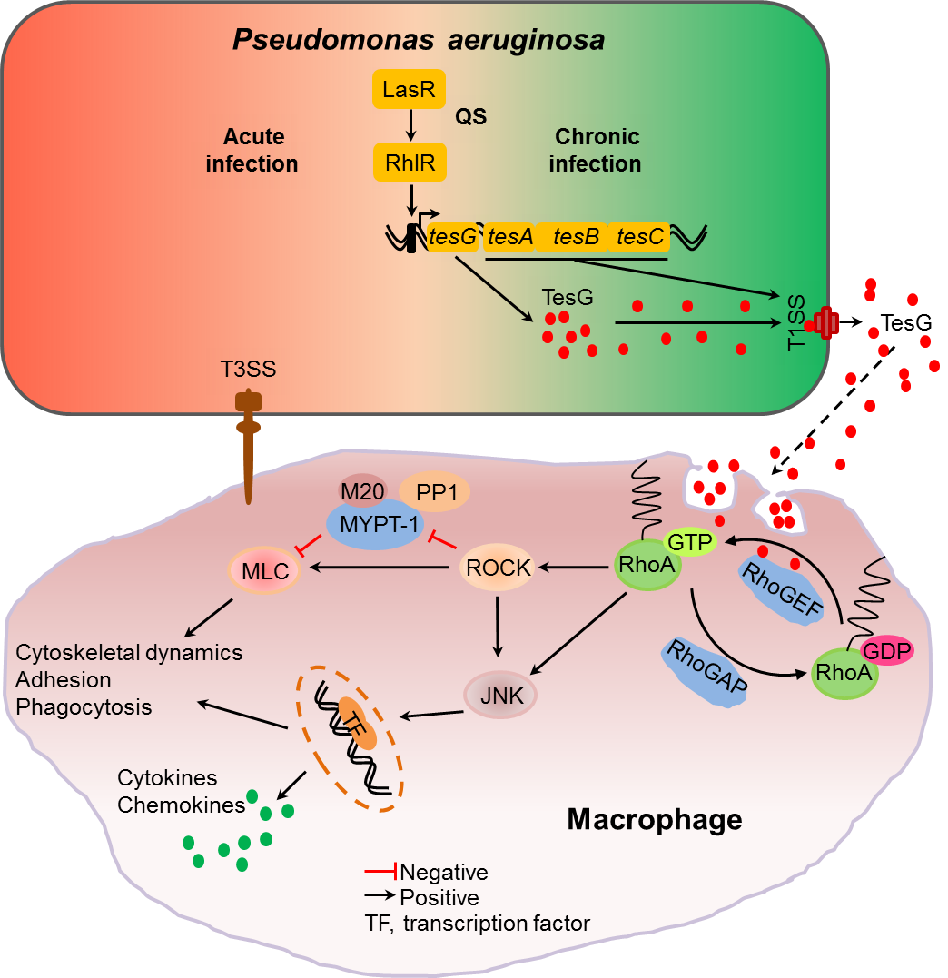 周西坤副研究员团队与张修月教授团队的研究成果揭示了铜绿假单胞杆菌引发慢性肺脏感染的一种新机制。研究人员成功构建小鼠急性和慢性肺脏感染动物模型,通过原位转录组测序对铜绿假单胞杆菌在两种不同入侵模型中的表达谱进行分析,发现在慢性肺脏感染中,铜绿假单胞杆菌可以通过群体感应(Quorum-sensing)系统调控一种命名为TesG的效应蛋白的合成,而后通过I型分泌系统Tes-T1SS将TesG蛋白分泌到细菌胞外环境。在将该效应蛋白TesG敲除后,铜绿假单胞杆菌介导的小鼠肺脏慢性感染能力显著降低。深入机制研究发现:TesG蛋白可由真核细胞网格蛋白介导的内吞作用进入巨噬细胞胞内,并通过竞争性抑制真核细胞small GTPase家族蛋白(如RhoA)的激活,从而抑制下游一系列的细胞炎症反应,如炎症细胞的募集、巨噬细胞细胞的骨架重排以及粘附和吞噬能力。