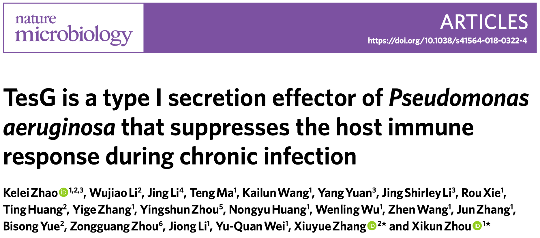 近日,我校华西医院生物治疗国家重点实验室周西坤副研究员团队和生命科学学院张修月教授团队在国际权威学术期刊Nature Microbiology(影响因子14.174)上发表了题为“TesG is a type I secretion effector of Pseudomonas aeruginosa that suppresses the host immune response during chronic infection”的研究论文。该研究由周西坤副研究员团队与张修月教授团队合作完成。论文第一作者为我校赵克雷博士(现任成都大学特聘副研究员)。周西坤副研究员和张修月教授为共同通讯作者。