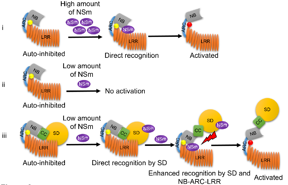 “迄今为止,绝大多数植物胞内免疫受体蛋白都使用单一的感知功能域来识别病原效应蛋白,通俗的说就是一次识别之后就会启动防御反应,Sw-5b已经能够通过NB-ARC-LRR结构域识别病毒效应蛋白,为什么还要多此一举,再进化出一个额外的感知结构域识别病毒效蛋白?”带着这样的疑问,研究人员深入研究发现,Sw-5b NB-ARC-LRR结构域实际上是个“多面手”,同时扮演“探测器”和“分子开关”的角色,它既能够探测识别病毒效应蛋白又能够开启植物防御系统诱导植物产生过敏性坏死反应,而Sw-5b SD结构域则作为另一个“探测器”去感知细胞中是否有病原菌的效应分子存在。虽然NB-ARC-LRR也能感知细胞中的病毒效应蛋白,但是这个“多面手”监测病毒的灵敏度并不高,当细胞中病毒效应蛋白NSm浓度很低时,NB-ARC-LRR不能有效对其监测。令人惊奇的是,Sw-5b SD探测器能显著增强NB-ARC-LRR对低浓度的NSm的识别能力并促进其激活诱导强烈的防御反应,实验数据显示,当SD探测器存在时,NB-ARC-LRR能够结合更多的病毒效应蛋白。该研究论文第一作者李佳博士给记者做了一番形象的描述:“Sw-5b N末端的SD结构域就像一个‘吸铁石’一样的探测器,即使细胞中病毒的效应蛋白浓度很低,SD探测器也能够将它吸附过来,形成富集效应,然后再将富集起来的病毒效应分子传递给NB-ARC-LRR这个探测器和分子开关,分子开关进行第二次识别验证无误后随即启动植物的防御反应,这样看来Sw-5b 通过采取两步识别的机制来提高监测病原物的特异性和灵敏度是非常巧妙的。”