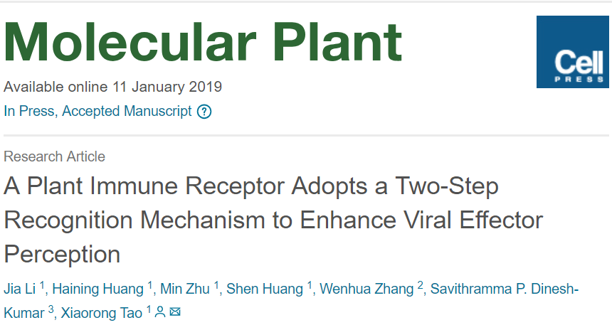 植物存在与动物类似的先天免疫系统,该免疫系统能够准确识别病原菌并激活植物的防卫反应。植物免疫系统利用一类胞内免疫受体专门负责监测病原菌的入侵,当监测到病原菌入侵时,植物免疫受体就能够被激活并针对入侵的病原菌发动国防战争,因此这一类抗病基因在农业生产和作物抗病育种中发挥非常重要的作用。植物胞内免疫受体发动的战争是一场对入侵病原菌极其惨烈的战争,植物通过启动细胞程序化死亡来限制病原菌的侵染,一旦发动了战争,植物往往需要付出自身死亡的代价,因此对植物来说不能发动错误的战争。微生物可能有益也可能有害,植物免疫受体到底如何区分是敌是友,如何准确识别入侵的是真正的敌人,进而发动一场对病原菌精确的打击,这是植物免疫系统监测病原菌研究中的前沿科学问题。我校植物病毒学研究团队的最新研究揭示了植物免疫受体蛋白对病原菌一种新的识别机制,研究发现在植物免疫系统监测病毒入侵时,植物免疫受体蛋白Sw-5b通过两步识别机制监测病毒入侵,第一步特异性识别病毒,打开一层开关,第二步再特异性识别病毒,进一步打开一层开关,通过双重保障,精确打开免疫受体这个分子开关,进而发动对病毒的国防战争,研究还发现两步识别机制能显著增强植物免疫系统对病毒入侵的监测能力,该研究成果于近日发表在国际知名学术期刊《分子植物》(Molecular Plant,IF: 9.326)。