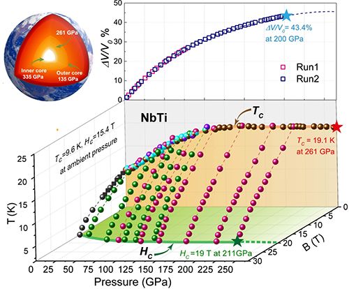 最近,中国科学院物理研究所/北京凝聚态物理国家研究中心超导国家重点实验室郭静副研究员、孙力玲研究员等和普林斯顿大学Robert J. Cava教授、合肥强磁场张裕恒院士、张昌锦研究员及郗传英研究员、中国科学院电工所王秋良研究员等合作,对铌钛合金超导体在超高压力下的超导电性进行了系统的研究。发现铌钛合金在高达261.7GPa的压力下仍保持具有零电阻的超导电性,这表明铌钛合金是所有超导体中目前已知的最耐压的超导体。 这个压力是已有报导的超导电性存在的最高压力。在该压力下铌钛合金超导体超导的转变温度由常压下的9.6K提高到了19.1K,合肥强磁场高压磁阻实验结果表明在211GPa压力和1.8K温度下其临界磁场由15.4T提高到了19T。这是过渡族金属元素合金超导体中所发现的最高超导转变温度和最高临界磁场。上海光源同步辐射高压XRD实验结果表明,在200 GPa压力下没有发生晶体结构变化,但其体积被压缩了大约43%。