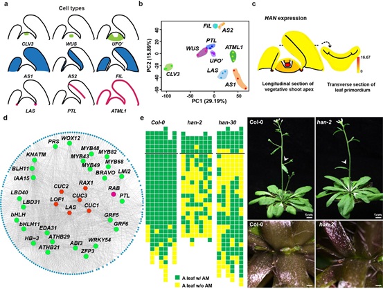 图:(a)茎顶端和叶片不同区域细胞类型示意图。(b)不同区域类型翻译组的主成分分析。(c)eFP浏览器展示HAN基因在茎顶端不同区域的表达模式。(d)共表达模块显著富集侧生分生组织起始相关基因。(e)新鉴定的与侧生分生组织起始相关基因HAN的突变体侧芽缺失的表型。 |