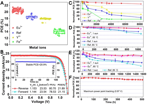 钙钛矿电池的长期稳定性和初始性能变化:(A)引入不同离子的钙钛矿电池的初始性能变化;(B)引入Eu3+的钙钛矿电池最优电池性能测试曲线及稳态输出;(C)引入不同离子的钙钛矿电池在暗态存放8000小时的性能变化;(D)半电池和(E)全电池光照或加热老化1000小时以上的器件性能变化;(F)引入Eu3+的器件在最大功率点连续工作性能变化。