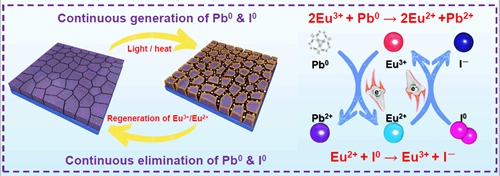 氧还离子对Eu3+/Eu2+循环消除Pb0和I0缺陷和Pb2+/I–离子对再生的机理图。
