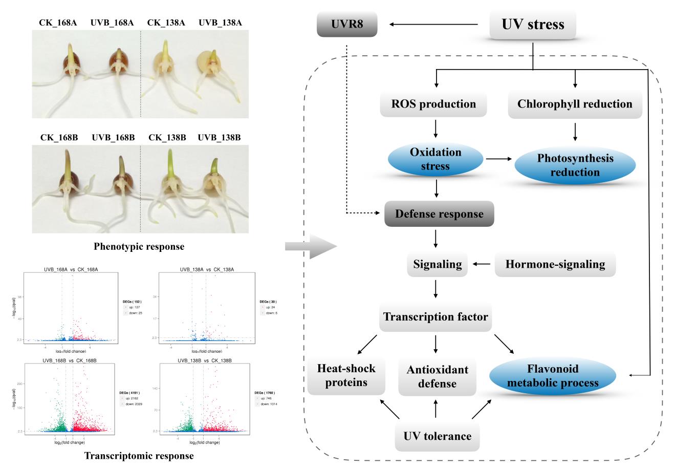 中国科学院成都生物研究所王涛课题组通过系统地鉴定不同小麦品种在紫外胁迫和非胁迫处理条件下的表型发现:紫糯麦168胚芽鞘受到的紫外胁迫程度较小,并伴有大量黄酮类代谢物的积累。高通量测序结果表明,紫外胁迫对植物光合作用以及固碳相关基因的表达具有明显的抑制作用,且紫糯麦168受到的抑制程度最小。紫糯麦168在紫外胁迫条件下的独特表现是由UVR8受体介导的多种防御响应相关基因的表达产生的,包括编码MAPK激酶、活性氧清除剂、转录因子、植物激素信号和酚类代谢物等相关基因。同时,利用HPLC-ESI-MS/MS技术对种植于成都和西藏的小麦籽粒进行代谢物含量与成分的测定,结果表明紫外胁迫对花青素类物质的积累具有显著促进作用。本研究所挖掘的基因可用于遗传改良小麦抗紫外能力。此外,富含花青素的小麦具有良好的营养价值,是作为功能性营养食品的优异资源。