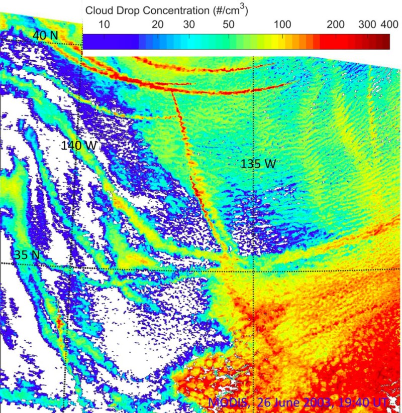 颜色表示云滴数浓度,单位为立方厘米。通过观察云滴数浓度的分布,可以很容易的辨别船舶排放的尾迹。当每立方厘米的云滴数量大于50时,降水被抑制的同时云的覆盖面积更大。而在船舶排放尾迹交汇处,云滴的浓度和云面积更大,更大的由小云滴组成的云层导致更多的太阳能量被反射回太空。