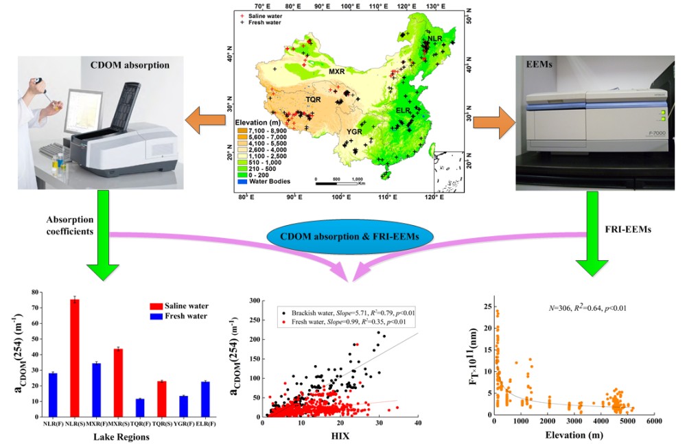 CDOM主要由富里酸、腐殖质和芳烃聚合物等物质组成,是水生生态环境中最大的溶解有机碳库。水体中的CDOM主要有外源和内源两个部分,外源主要由陆生植被降解后形成的腐殖质由河流携带进入水体中;内源主要由浮游植物的光学降解形成。目前关于内陆湖泊CDOM的研究多集中在单一的淡水湖泊中,对于咸水湖泊的CDOM研究非常有限,尤其是全国范围的咸水湖泊CDOM研究还鲜见报道。中国科学院东北地理与农业生态研究所水环境遥感学科组的科研人员历经4年时间,对分布在全国的234个湖泊进行了野外调查采样,对全国范围内的936个淡咸水湖泊CDOM 样品利用紫外吸收技术、三维荧光技术及荧光区域积分分析法,对比探讨了淡咸水湖泊的CDOM组分及其主要来源。研究表明咸水湖泊CDOM含量明显高于淡水湖泊的CDOM含量,类腐殖质和类富里酸是湖泊CDOM荧光物质的主要组成部分,并且随着海拔高度的增加,CDOM荧光强度显著降低。本研究表明淡咸水湖泊CDOM的分布有显著差异性,这对于今后分析内陆湖泊在碳循环过程中的作用具有重要意义。