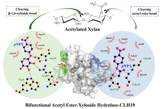 近日,中国农业科学院农产品加工研究所食品酶工程创新团队研究发现了一种可以兼顾水解木聚糖主链(β-1,4-木糖苷键)和侧链(乙酰酯键)的双功能水解酶CLH10,并揭示了其以单一序列结构域识别两种不同底物和催化两种不同类型反应的分子机制。该研究系统地从酶的“序列-结构-功能”角度阐释了一种新型水解酶的双功能形成和催化机制,对新酶的筛选、人工设计和定向进化提供了全新视角。相关研究成果在线发表在美国化学会期刊《ACS Catalysis》上。