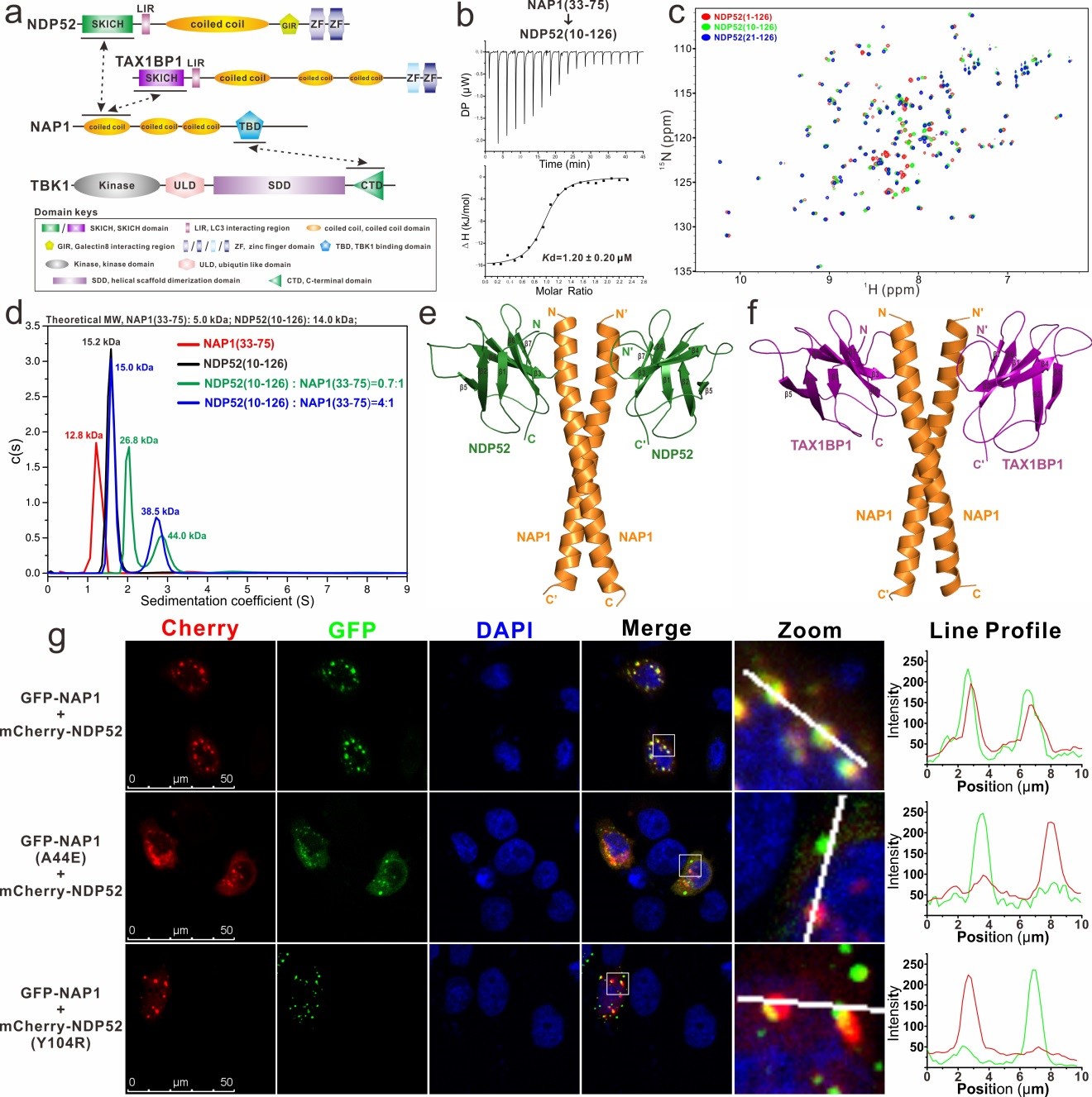 图1. 自噬受体蛋白NDP52和TAX1BP1结合NAP1的分子机制