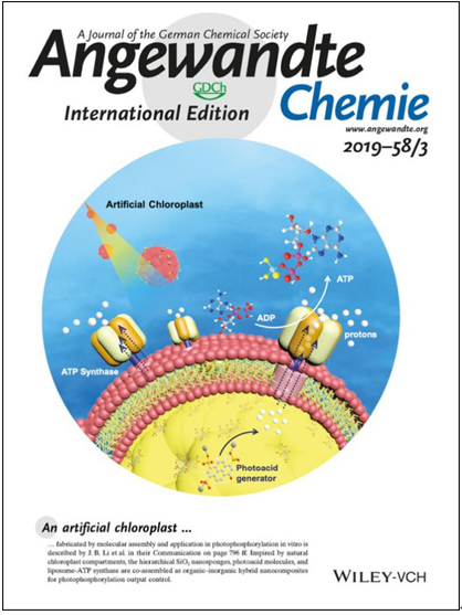 基于以上研究工作,科研人员最近从天然叶绿体结构出发,利用可牺牲模板法获得了能高效包埋光酸分子的多腔室介孔二氧化硅材料,随后在其表面重组含有ATP合酶的磷脂双层,从而构筑了一种“人工叶绿体”分子组装系统。进一步研究表明,在光照下,上述分子组装体系在体外可实现了可控与高效的ATP合成。该体系的建立为提高光能利用率提供了新途径和新思路,被评审人认为是最接近真实叶绿体结构和功能的人工合成系统。相关研究成果发表在近期的 Angew. Chem. Int. Ed. 2019, 58, 796, 并被选为“Hot paper”。