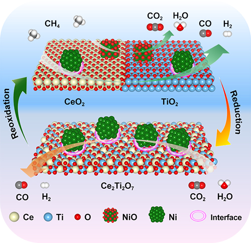 在前期水裂解研究工作中(AIChE J),该团队开发了一种CeO2-SnO2复合氧化物相变材料,可有效降低第一步热还原温度,提高氢气的产量。然而该方法的水裂解速率较低,氢气的产生速率和循环稳定性有待进一步提高。在此基础上,该团队开发了一种CeO2-TiO2复合氧化物负载的镍基催化剂,并在第一步热还原过程中引入还原剂——甲烷,可以大幅提高太阳能燃料的产生速率和产量。研究发现,在900°C等温条件下,二氧化碳和水裂解反应生成一氧化碳和氢气的产生速率分别高达168.8和97.5mLmin-1g-1,是目前已有报道的最高值。此外,甲烷部分氧化的转化率高达近100%。该催化剂经过50个氧化还原循环后,仍能够保持较高的二氧化碳和水裂解速率和甲烷转化率。详细的表征和DFT理论计算研究表明,单质镍和CeO2-TiO2复合氧化物存在协同效应:单质镍和镍/氧化物界面为该循环反应的活性中心,可有效活化惰性气体分子二氧化碳、水和甲烷,促进循环过程中CeO2-TiO2复合氧化物到Ce2Ti2O7烧绿石的相变,以及铈的深度还原;循环过程中CeO2-TiO2复合氧化物晶格氧的嵌入与脱除为二氧化碳和水裂解,以及甲烷部分氧化提供了热力学驱动力,从而实现该催化剂的高活性和高稳定性。该工作为设计高效催化体系用于太阳能热化学储能技术提供了重要的理论依据和全新的策略。