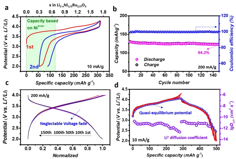 图 1. Li2Ni1/3Ru2/3O3的电化学行为曲线。(a)前两圈充放电曲线(10 mA g-1); (b)200 mA g-1倍率下的循环曲线;(c) 200 mA g-1倍率下的放电容量归一化曲线;(d)首圈的恒电流间歇滴定(GITT)测试及相应的锂离子扩散系数。
