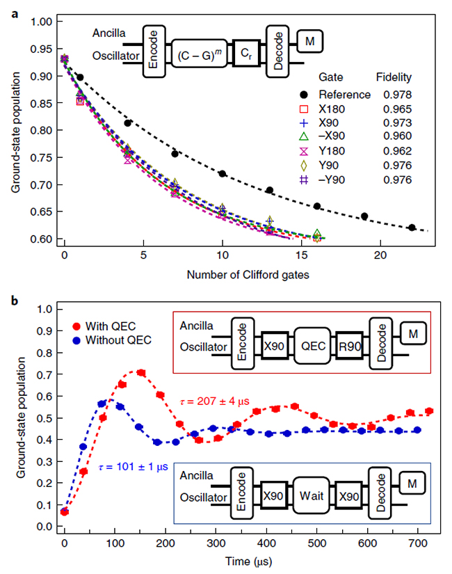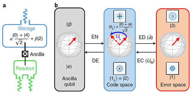 在一般的量子纠错方案中,每个逻辑量子比特由很多个物理比特组成,通过冗余的自由度实现纠错。然而,随着物理比特数目的增加而系统可能发生的错误通道也会增多,同时多物理比特编码的操作需要物理比特之间非局域的相互作用,因此实验上量子纠错和逻辑比特的量子门都很难实现。为了克服这些问题,孙麓岩研究组采用了一种基于单个微波谐振子的物理架构,首次在实验上证明了二项式量子纠错码和在纠错保护下的量子门操控。在该方案中,单个微波谐振子的无限大希尔伯特空间提供了有效的冗余自由度来实现量子信息编码,而错误通道的数目保持不变(主要为微波光子的丢失),因此对硬件的要求大大简化,具有非常强的可操作性。