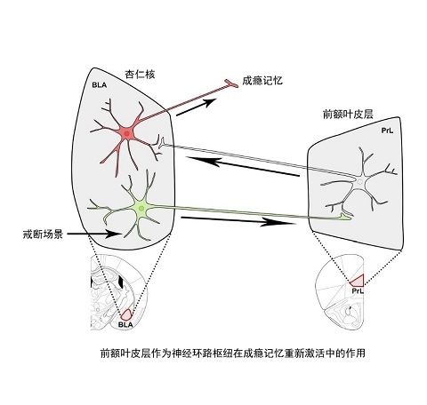 郑平课题组将将毒品成瘾鼠放在两个场景不同的盒子中,然后在一个盒子中使成瘾鼠突然戒断毒品,这时成瘾鼠会产生痛苦的戒断症状,形成成瘾记忆,并且将这个记忆与其所处的场景联系到一起,以后将这个鼠再放到这个场景中,戒断场景可以重新激活成瘾记忆,从而表现为“逃离”这个盒子。利用这个模型,课题组研究发现戒断场景可以激活杏仁核投向前额叶皮层的神经环路,如果抑制这条环路可以明显抑制戒断场景对成瘾记忆的激活。然而,这条通路激活后,通路本身并没有记忆信号的提取,仅仅是将信息输送到前额叶皮层,然后由前额叶皮层通过其投射神经将信息再次发送到杏仁核,激活杏仁核另一群神经元,引起记忆信号提取。研究工作证明,前额叶皮层作为神经环路的枢纽在戒断场景重新激活成瘾记忆中发挥了重要作用,将为有效干预毒品复吸提供新思路。