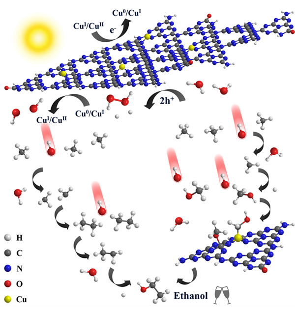 针对甲烷容易发生过度活化并彻底矿化的问题,从活性氧物种的生成以及甲烷的吸附活化两个角度出发,研究团队通过在氮化碳材料的有序空腔中进行铜修饰,不仅实现了羟基自由基的原位生成,还促进了材料对甲烷C-H键的活化以及对高活性中间物种的稳定。该材料表现出卓越的光催化甲烷转化性能,乙醇的产率达到106 μmol g-1 h-1,为目前相关领域报道的最优值。深入研究表明,除了自由基机制以外,该材料中的铜物种与邻近碳原子存在协同效应,使得转化过程沿着甲烷-甲醇-乙醇的路径进行。该工作提出了温和条件下甲烷向液体燃料直接转化的新策略,有助于加深对多碳产物的形成机制的认识。