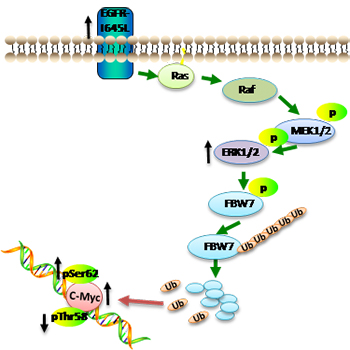 目前,sorafenib和lenvatinib是FDA批准的用于肝癌一线治疗的靶向药物,但这些药物在肝癌的治疗中响应率较低,一般只能延长患者3个月左右的生存期。过去的研究表明BRD4(BET-Bromodomain4)抑制剂——JQ1,其可通过抑制c-Myc转录和表达来引起肝癌细胞凋亡,因此在肝癌临床治疗中具有重要潜力。但是,只有部分c-Myc高表达的肝癌细胞对JQ1表现为敏感,而其中的分子机制尚不清楚。针对此问题,该团队利用基因组学的研究方法,在JQ1不敏感型肝癌细胞株中发现新的获得性EGFR-I645L突变。该突变可持续激活MAPK信号通路来促进c-Myc蛋白ser62位点的磷酸化,从而稳定了c-Myc并介导了肿瘤细胞对JQ1的耐药性。研究还发现体内和体外联合JQ1与EGFR或ERK专一性抑制剂可以有效地抑制肿瘤细胞的生长。该研究结果阐明了肝癌细胞对JQ1耐药的分子机理,为提高临床抗肿瘤药物的有效性提供了理论基础。