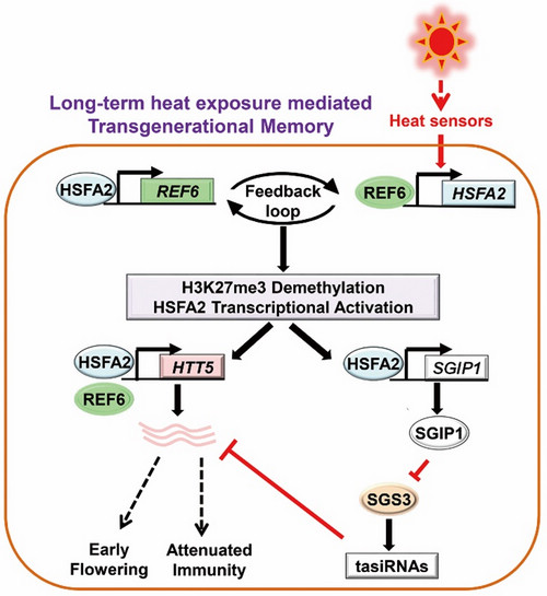 曹晓风与何祖华研究组合作,利用遗传学、生物化学和分子生物学等研究手段,揭示了表观遗传修饰在植物响应高温胁迫和传代记忆中的作用机制。研究人员发现,高温能够促使拟南芥提早开花和增加拟南芥的感病性,同时也可以传递给下一代,表现出传代记忆效应。通过遗传筛选手段,研究者鉴定到一个F-box泛素连接酶SGIP1(SGS3-INTERACTING PROTEIN1)参与高温环境下SGS3的蛋白降解,而高温对SGIP1的上调表达同样具有传代记忆。对传代记忆机制的深入研究表明,高温能激活热激转录因子HEAT SHOCK TRANSCRIPTION FACTOR A2(HSFA2)。HSFA2能靶向激活H3K27me3去甲基化酶REF6,REF6的上调表达又能反过来降低HSFA2位点上的H3K27me3修饰水平,从而减弱H3K27me3对HSFA2转录的抑制作用。因此,REF6和HSFA2形成一个正向反馈回路从而维持了植物对高温的传代记忆。这个反馈循环能够激活泛素连接酶SGIP1的表达,进而通过降解SGS3蛋白抑制ta-siRNAs的产生。REF6-HSFA2反馈回路和ta-siRNA含量下降共同作用,上调了REF6、HSFA2和ta-siRNA的共同靶标HEAT-INDUCED TAS1 TARGET 5(HTT5)的表达,最终导致植物开花提前和感病性增加的表型。